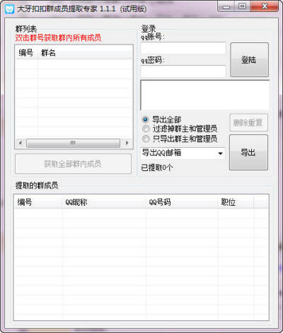 大牙QQ群成员提取软件是一款绿色小巧的QQ群成员提取工具,可以帮助用户快速提取全部群成员或者仅提取管理员,并方便导出操作,需要的朋友可以下载体验一下。