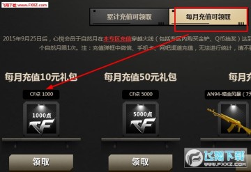 3、在每月充值可领取中大家可以看到“每月充值10元礼包”,充值换算下来之后就是50RMB可以的11000CF点