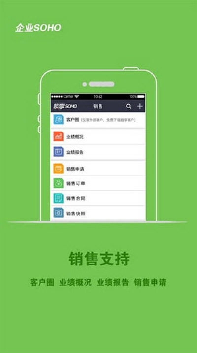 销售:工作外勤、客户圈、销售订单、销售合同、销售快照、销售申请、业绩报告、业绩概况;