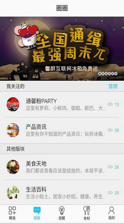 馨小厨app包括精选、圈圈、提醒、食材、我的等多个功能模块,智能的软件服务让你的厨房生活,不再枯燥无聊