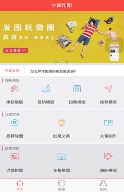 小微作图app是一款类似于微商水印相机包含各种微商模板的手机app,还有更多吸引人的文案等你来发现,还能快速将小微作图手机版添加到桌面,经常写微信公众号文章的小伙伴们千万不要错过哦。