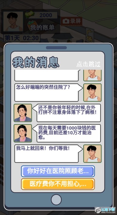 这款抖音热门经商逆袭小游戏,解锁逆袭剧本从小摊位开始经营,一步步经商逆袭,积攒资本成功逆袭成为霸总,非常有趣。在游戏当中面对人生中的各种困难,感受如何经营赚钱,你需要赚钱为父母治病,开启经商,掌握更多的生活技巧去努力的活下去。