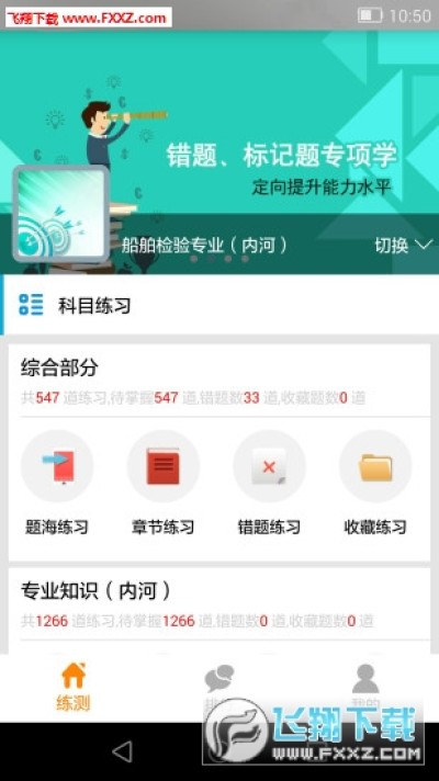 渔检通app练测帮是一款用于企事业单位员工进行理论知识学习的移动应用。提供各类试题知识内反复强化练习、模拟考试、线上考试、实时排名等功能。
