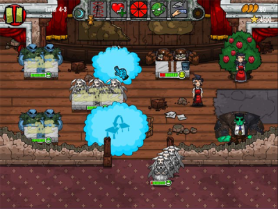 游戏的玩法很常见,但是题材却非常的新颖——一个为怪物们服务的餐厅,在游戏里,你不光要为僵尸服务,甚至还有众多闻讯而来的其他怪物:女妖、吸血鬼、科学怪人狼人等。游戏中场景与人物都画得不错,尤其是讲述故事剧情类似于连环画的图片,可见游戏公司在美工上还是花了一番心思的。