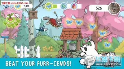 游戏卡通风格,猫猫十分可爱,与跑酷游戏玩法基本一致,点击跳跃、下滑躲避、长按飞跃,穿过花园,在奔跑的同时收集蝴蝶,不过要当心刺猬和老鼠,它们为你设置了陷阱。