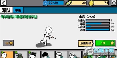 1、游戏中玩家可以进行多种不同兵种火柴人士兵的招募进行战斗。
