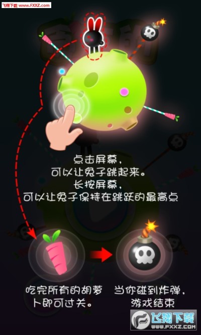 在旋转的球球上,同时存在炸弹和胡萝卜,你需要操控兔子跳起来吃掉胡萝卜,同时避开炸弹,1200关!你能过多少关?