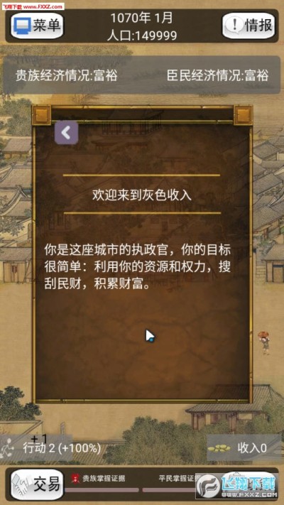 灰色收入是一款经营手游,选择不同的历史场景,体验那是的政权交易,选择你想经历的不同的历史背景,作为执政官的你,需要了解民情以及经商情况,发布相关的政策法规,用利益给你带来金钱利益,喜欢点击下载吧!