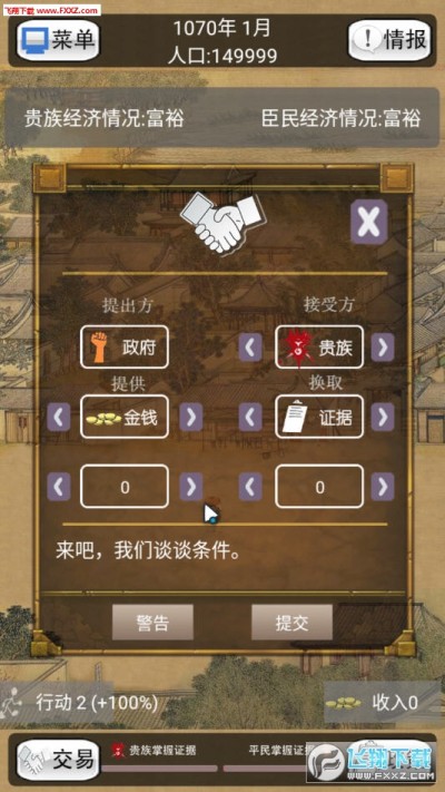 交易系统:游戏中的各势力拥有自己的资源,同时窥伺其他势力的资源,此时可以通过交易来分配各方资源。适时提出交易,可以达到事半功倍的效果。