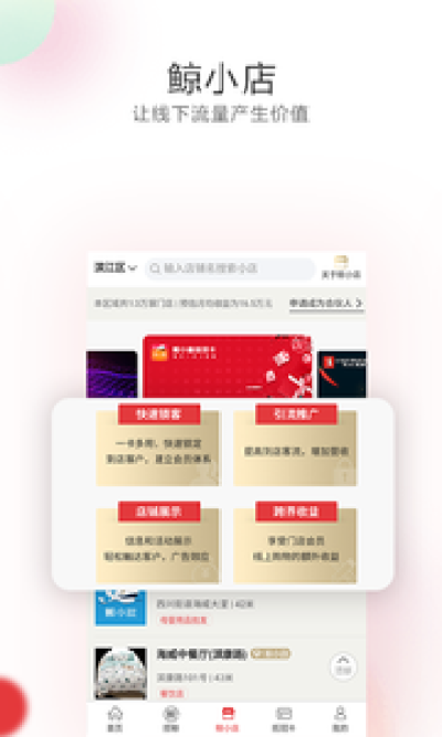 线下实体生意受电商冲击,鲸小喜app可以帮助门店主从电商中分得一部分红利。