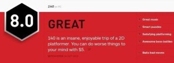 140是一款将音乐元素和横版动作完美结合的小游戏,该作的画面由五颜六色的像素堆砌而成,如此抽象的画面和律动十足的电子乐搭配,才组成了游戏的核心部分。游戏依赖反应的操作模式暗暗与游戏的音乐互相调谐,简单又充满挑战的关卡让人满意。