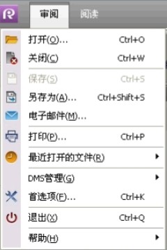 点击Reader图标,弹出下拉菜单(如下图),包括以下选项:打开、关闭、保存、另存为、邮件、打印、最近打开的文件、DMS管理、首选项、退出和帮助。