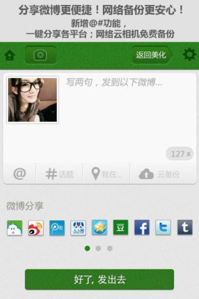 6、一键多平台分享:可将照片一键分享到新浪微博、腾讯微博、POCO微博、人人网、QQ空间、豆瓣、Facebook、Twitter、Tumblr,内置@和#功能让分享微博更便捷!