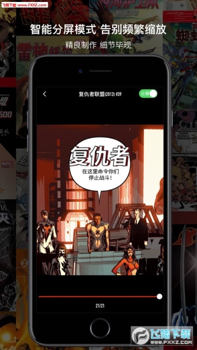 手机看漫画觉得屏幕太小?我们有独家的智能分屏模式,带你细致查看漫威编辑精心编排的分镜,不再需要无数次的放大缩小。
