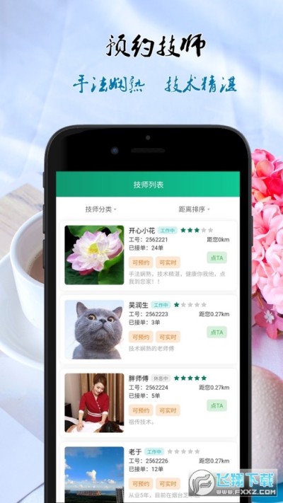 3、附近技师:根据地图和定位,快读找到距离近、上门快的技师,有地图模式展示和列表模式展示