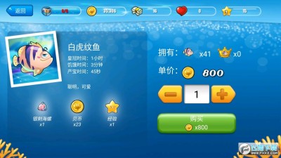 手指轻点,喂鱼、逗鱼轻松完成,点击鱼儿还会有意想不到的超独特动画效果;看着鱼儿舒畅自由的游动,让您的身心都能自由舒展。通过悉心照料你的鱼儿可以获得经验值和众多珍贵宝物!