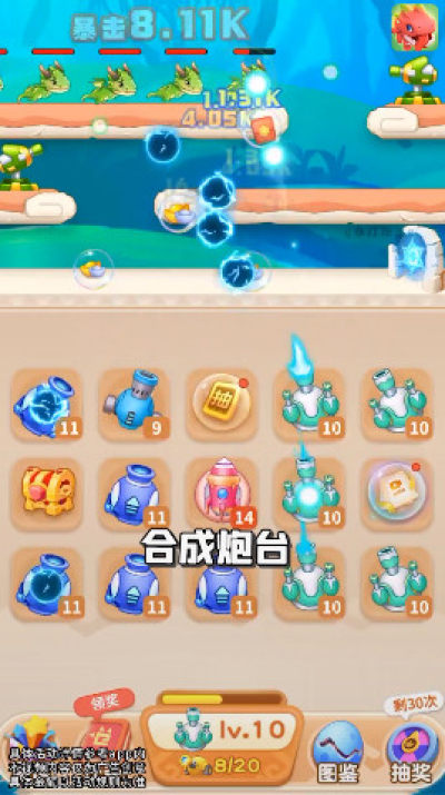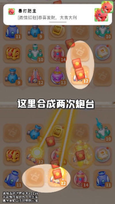《暴打肥龙红包版》是一款合成类型的红包游戏。玩家在游戏中通过合成的方式来形成炮台,玩家每次合成炮台都可以获得一个红包奖励,红包满0.3元即可提现!解锁更多的炮台暴打肥龙,赚取更多的红包奖励吧!