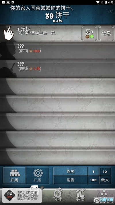 2、同时你还可以使用收益来购买升级道具与提升饼干生产速度的产品,比如说你可以购买一个光标,自动点击饼干。