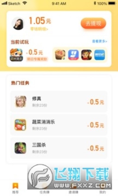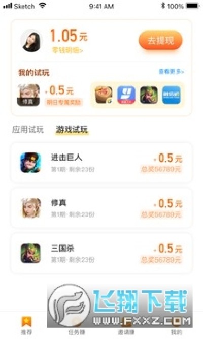 1、软件主要提供游戏赚和试玩应用赚,游戏赚任务多、奖励高,试玩任务操作简单、同期短。