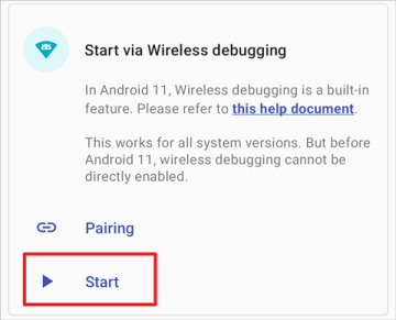 通过无线调试启动适用于 Android 11 或以上版本。这种启动方式无需连接电脑。由于系统限制,每次重新启动后都需要再次进行启动步骤。