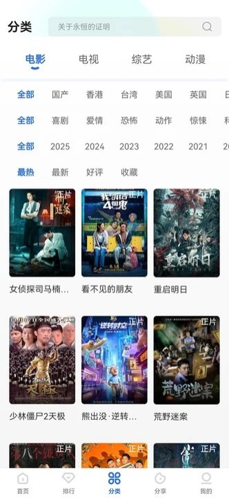 2、在分类板块,可按电影、电视、综艺、动漫等类型,以及产地、题材、年份、热度等维度进行筛选。