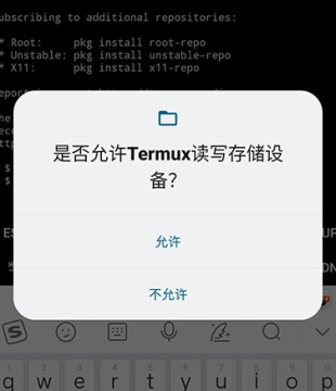 在 Termux 中输入命令 termux-setup-storage 回车以获取储存权限(注:长按后按 Paste 粘贴),如下图,点允许即可。