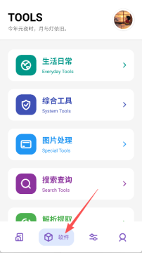 2、在下方的导航栏中点击“软件”选项,进入工具中心。
