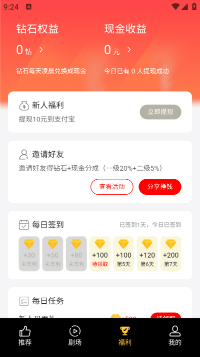 3、在福利页面中可以了解钻石收益和现金收益,还有新人福利、每日签到以及每日任务等内容;