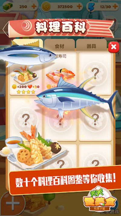 6、在主界面点击左下角的+号可以打开更多功能,点击食材升级可以消耗星星和金币升级食材获得更多收益。