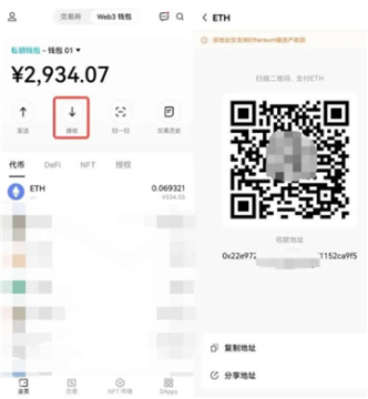 3、点击【接收】,选择转入币种,会弹出收款地址,复制地址粘贴到其他平台或者钱包的提币界面,便可以将数字资产成功充入Web3钱包。