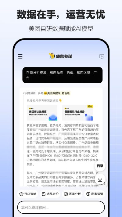 美团自研的“Longcat龙猫”大模型驱动,整合全国数百万商家数据、亿级消费行为及十年实战经验,提供“数据+场景+专家”一站式解决方案。百位行业专家参与训练与测评,确保建议可落地。从赛道选择、门店选址,到菜品研发、商家运营,让决策更科学,增长更简单。