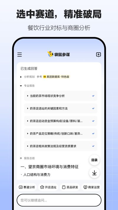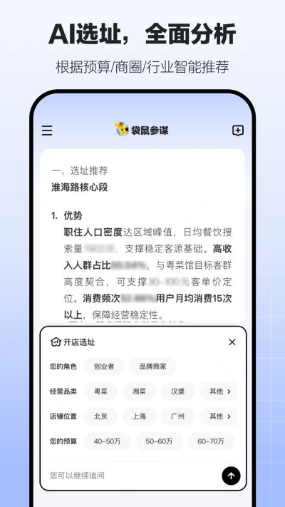 袋鼠参谋app是一款美团官方打造的智能ai软件,可以帮助广大有意开店的用户进行智能分析,包含门店前置工作以及选址地点参考等等,从零开始帮助用户出谋划策。对软件感兴趣的话不妨点击下载试试!