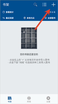 1、打开myReader安卓最新版本app不用任何登录操作即可点击右上角的添加按钮将本地书籍文件导入进来