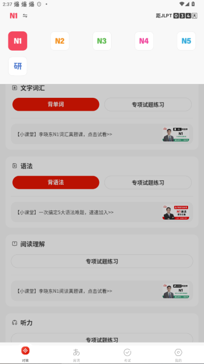精准覆盖日语 N1 至 N5 所有等级考试,同时包含英语能力测试内容,无论是日语初学者(N5 入门)还是高阶备考生(N1 冲刺),或是英语能力提升者,都能找到对应学习资源,无需切换多平台。