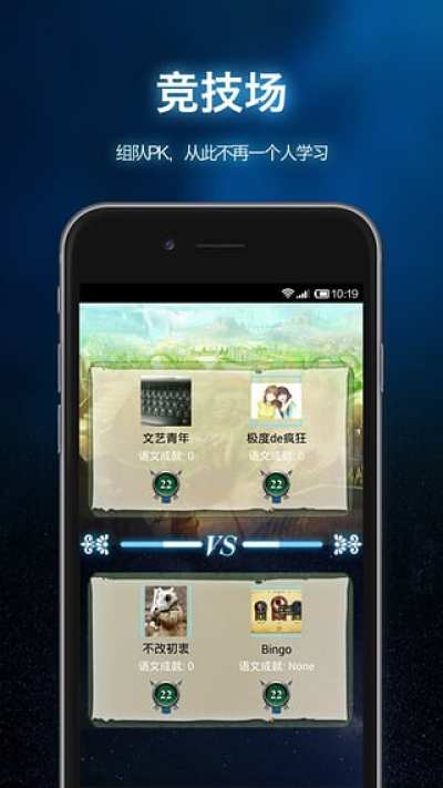 - 吸纳Dota,LOL和炉石传说的对战机制,在战场中平台采取2v2的组队pk模式,为你匹配实力相 近的队友以及对手,进行不同学科的答题战役。