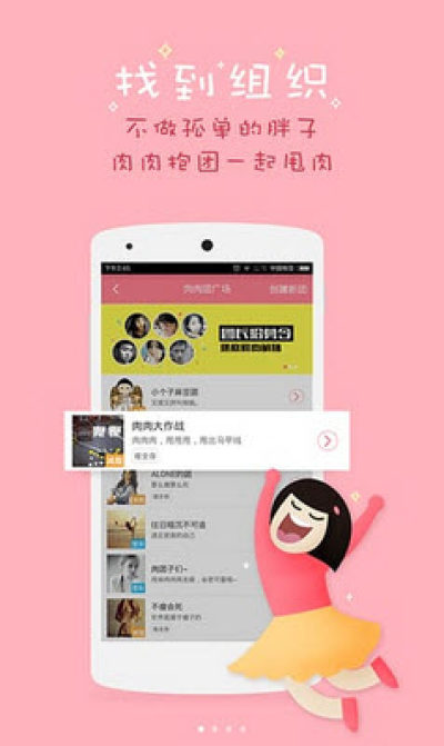 坚持不下去怎么办?肉肉帮你组团减肥,大家互相监督,互相鼓励培养减肥乐动力,更有爱心满满的团长时刻“敲打”你,让减肥之路不再孤单。