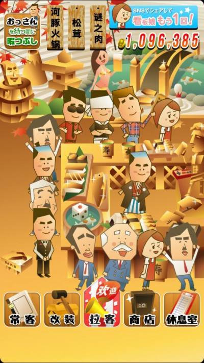 这是一款以各种11区喝酒大叔作为主角设计的一款手游,游戏中玩家将经营一家居酒屋,不断的吸引更多的顾客前来光临消费,通过收集金钱来装修自己的居酒屋,这款放置手游非常的好玩。