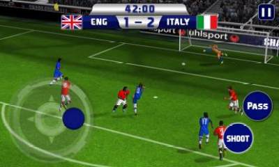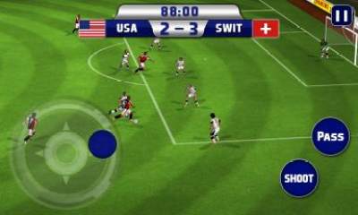 本款游戏的操作很简单,在屏幕的左下角有摇杆控制球员运动,右下角有踢球的功能选项。