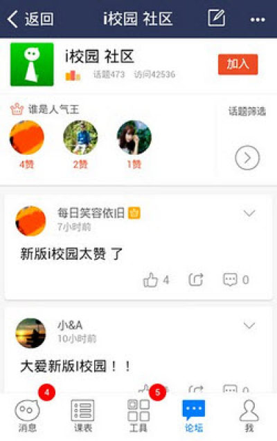 i校园为大家提供了很多别具特色的学习工具,课程表、查成绩、图书馆、自习室、蹭课和校车等功能应有尽有,另外还有特别丰富的社区生活,有需要的朋友快来免费下载体验吧!