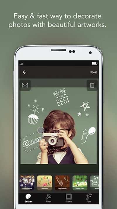 - 照片贴纸:来自多名艺术家制作的上百种贴纸可供使用。贴纸包含了非常多的样式,分别有涂鸦、卡通可爱风、大头贴、装饰物以及精美艺术作品等。