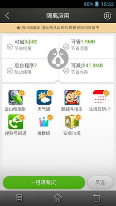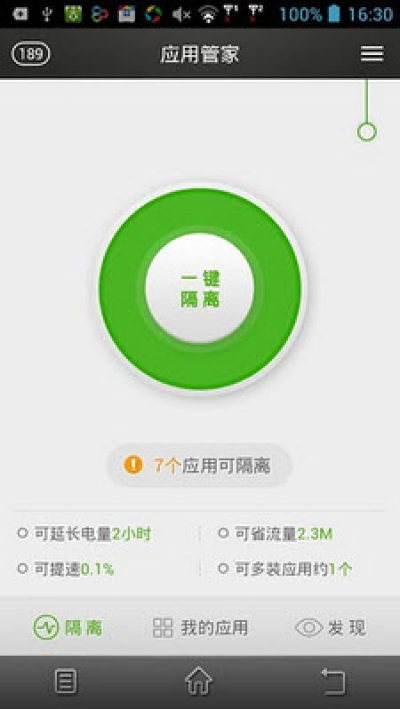 1.安卓系统机制会导致大量的程序和服务在后台运行,应用管家通过隔离应用进行处理,帮您甄别损耗手机内存、耗电、耗流量以及获取过多权限的应用,彻底释放手机内存,手机再也不卡顿。