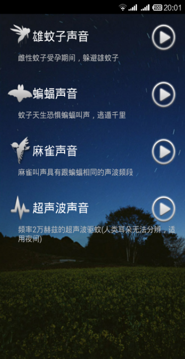 软件内置了多种驱蚊声音,更有超出人类听觉范围的超声波音频,达到在睡眠时一边驱蚊,同时不受噪音干扰的效果