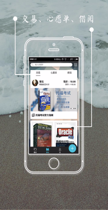 这是一款书籍交易,校园社交软件,在这里你不仅可以轻松的联系学长学姐购买、借阅书籍、在限定时间内订购低折扣教材,还能认识更多的同校同学,相互交流,扩大交际圈子。让书籍连接你我,聚集校园资源。