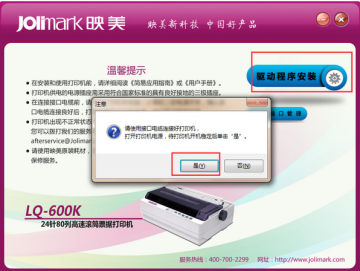 3、点击【驱动程序安装】按钮,使用接口电缆连接好打印机,打开打印机电源,待带印记开机稳定后点击“是”即可开始安装