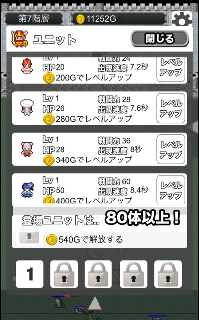 以魔王城下为舞台的怪物和勇者为题材的无尽战斗游戏,打倒怪物,获得有用的强化品和升级道具