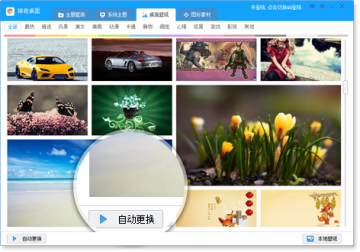 一键开启自动换壁纸功能,您无需指定图片,只需要指定您喜欢的图片分类,并且在指定的时间间隔内,自动为您更换壁纸,免去手动更换烦恼,让换壁纸更简单。让您的桌面天天都有新的气息!