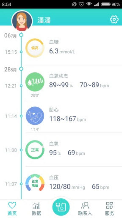 1.全面的检测项目:包括血压、脉搏、血氧、血氧动态、心率曲线。即将陆续推出耳温、胎心、胎动、血糖、心电、基础体温、尿液检测等。