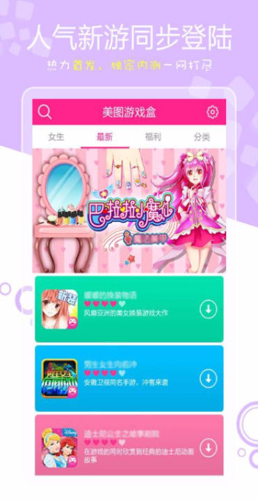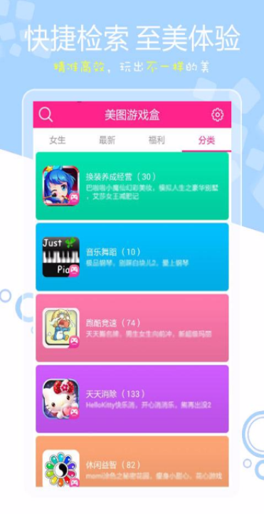 虽然玩游戏的用户大部分都是男性,但是对于手游来说女性玩家还是有占很大一部分的。女性玩家们如果想要更快的找到适合自己的手游,建议试试这款美图游戏盒APP。