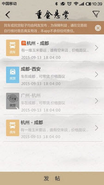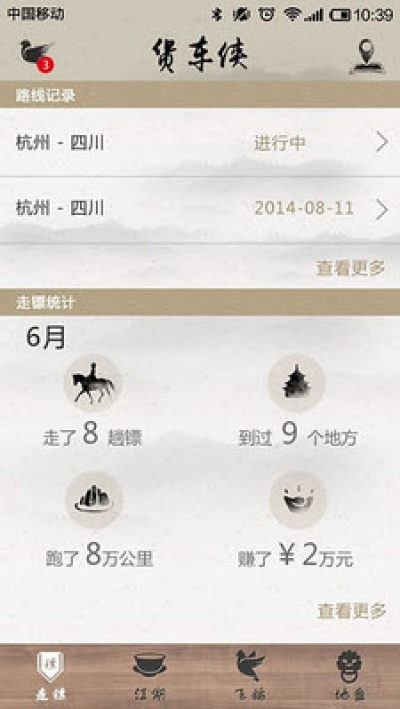 走镖:记录货运路线,花多少赚多少,提醒收账,贴心的记账功能江湖:找货接货,路途中的路况提醒及丰富的货车保养知识飞鸽:与好友的免费通话