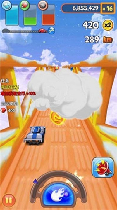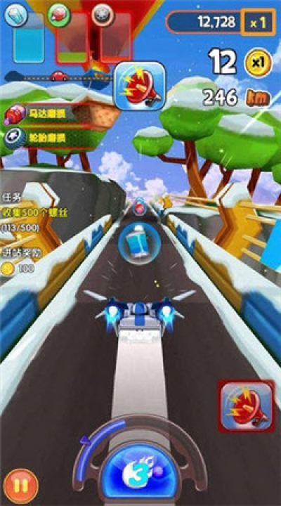 要注意躲避路途中的障碍物,小心那些负能量道具。进站后你可以修理你的车辆,向下一站发起挑战!